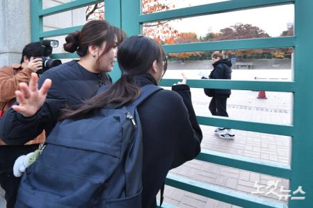 2025학년도 대학수학능력시험 일인 14일 오전 서울 서대문구 이화여자외국어고등학교에 마련된 고사장 앞에서 수험생이 가족의 응원을 받고 있다.