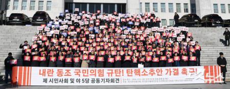 6일 오전 국회 본청 앞에서 열린 '내란 동조 국민의힘 규탄, 탄핵소추안 가결 촉구' 제 시민사회 야5당 공동 기자회견 참석자들이 구호를 외치고 있다.