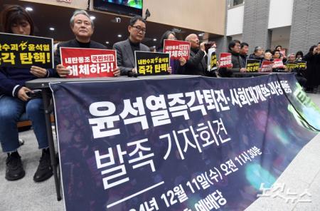 11일 오후 서울 종로구 향린교회에서 ‘윤석열 즉각 퇴진·사회대개혁 비상행동 발족 기자회견’ 이 열리고 있다.
