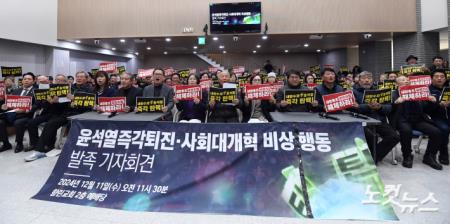 11일 오후 서울 종로구 향린교회에서 ‘윤석열 즉각 퇴진·사회대개혁 비상행동 발족 기자회견’ 이 열리고 있다.