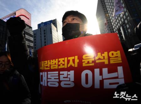 12일 오후 서울 중구 세종대로에서 열린 ‘내란주범 윤석열 즉각 탄핵·구속! 내란동조 국민의힘 해체! 노동자 시민대회’ 참가자들이 구호를 외치고 있다.