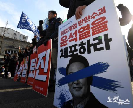 12일 오후 서울 중구 세종대로에서 열린 ‘내란주범 윤석열 즉각 탄핵·구속! 내란동조 국민의힘 해체! 노동자 시민대회’ 참가자들이 구호를 외치고 있다.