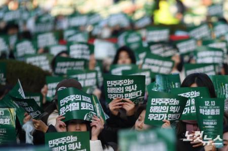 13일 서울 이화여대 ECC 야외계단에서 열린 이화여대 학생총회 정권퇴진을 위한 학생 투표에 참석한 이화여대 학생들이 피켓을 들고 있다.