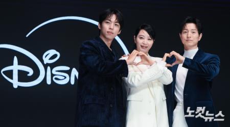 배우 주종혁(왼쪽부터), 김혜수, 정성일이 8일 서울 여의도 콘래드 서울 호텔에서 열린 디즈니+ 오리지널 시리즈 '트리거' 제작발표회에서 포즈를 취하고 있다.