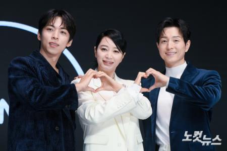 배우 주종혁(왼쪽부터), 김혜수, 정성일이 8일 서울 여의도 콘래드 서울 호텔에서 열린 디즈니+ 오리지널 시리즈 '트리거' 제작발표회에서 포즈를 취하고 있다.