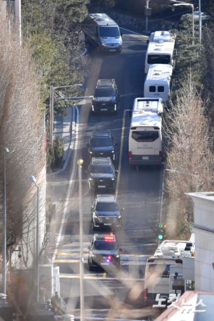 고위공직자범죄수사처와 경찰에 의해 체포된 윤석열 대통령이 탑승한 차량이 15일 오전 서울 용산구 한남동 윤석열 대통령 관저를 나서고 있다.