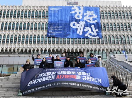 10일 오후 서울 서대문구 연세대 학생회관 앞에서 열린 '윤석열 대통령 탄핵 반대' 기자회견에 참석한 연세대 학생들이 구호를 외치고 있다.