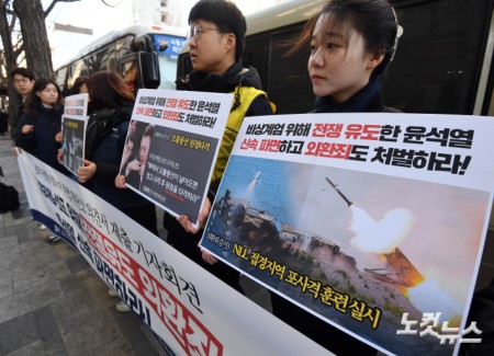 윤석열 대통령 탄핵심판 8차 변론이 열리는 13일 오전 서울 종로구 헌법재판소 인근에서 평화주권행동 평화너머 관계자들이 ‘비상계엄 선포 위해 전쟁유도 외환죄, 윤석열 신속 파면하라’ 헌법재판소 시민의견서 제출 기자회견을 갖고 있다.