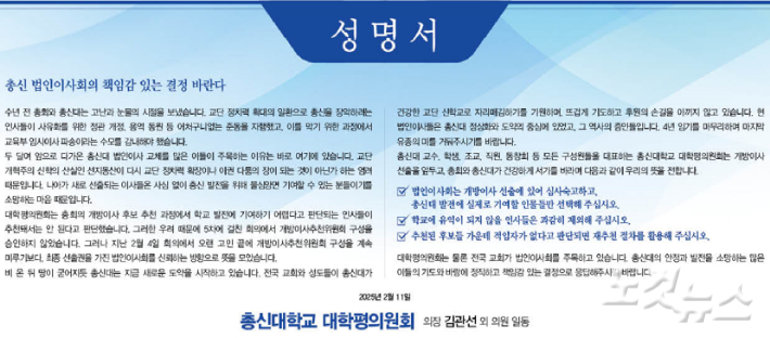대학평의원회는 성명에서 많은 이들이 법인이사 교체를 주목하고 있다면서, "학교가 다시 교단 정치력의 확장이나, 이권다툼의 장이 될까 염려하고 있다"고 전했다.