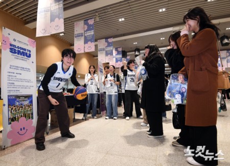 18일 오후 서울 용산구 숙명여대에서 열린 ‘2025학년도 신입생 오리엔테이션’ 에 참가한 농구동아리 소속 재학생이 신입생들에게 시범을 보이고 있다.