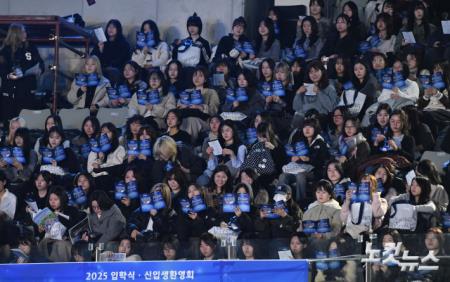 24일 오후 서울 중구 장충체육관에서 열린 2025 숙명여자대학교 입학식에서 신입생들이 교가를 배우고 있다.