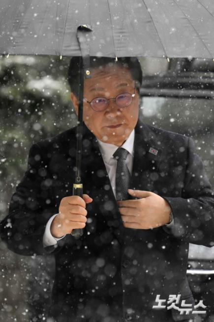 이재명 더불어민주당 대표가 4일 서울중앙지법에서 열린 '대장동 사건' 공판에 출석하고 있다. 이번 공판은 법관 정기인사로 재판부가 교체된 이후 처음 열리는 재판이다.