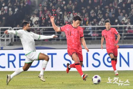 황희찬이 20일 경기도 고양종합운동장에서 열린 2026 국제축구연맹(FIFA) 북중미 월드컵 아시아 지역 3차 예선 대한민국 대 오만 경기에서 선제골을 성공시키고 있다.