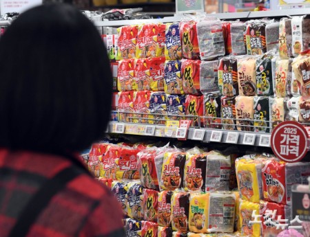 오뚜기의 라면값이 인상된 1일 서울의 한 대형마트에 오뚜기 라면이 진열돼 있다. 오뚜기의 라면값 인상은 지난 2022년 10월 이후 2년 5개월 만으로 27개 라면 중 16개 제품의 출고가를 평균 7.5% 인상한다고 발표했다.