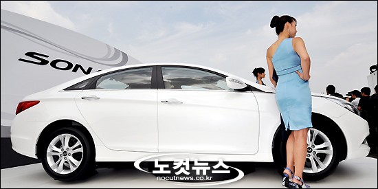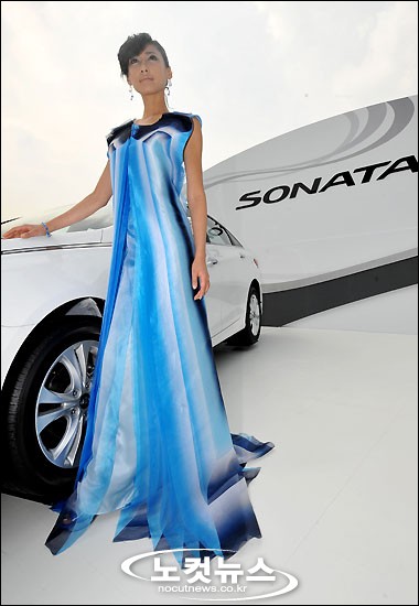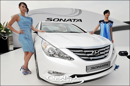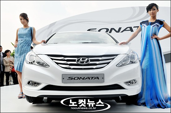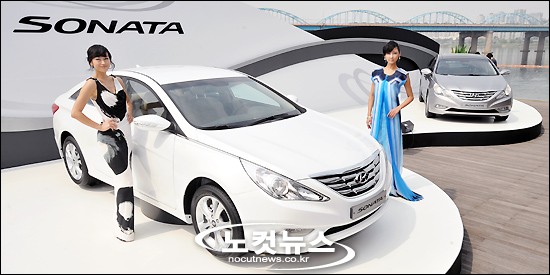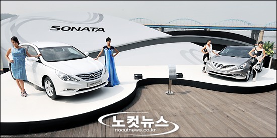 17일 서울 한강시민공원 반포지구 마리나 제페에서 열린 현대자동차의 신형(YF) 소나타 쇼케이스에서 모델들이 신차와 함께 포즈를 취하고 있다.