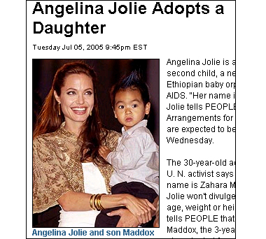 2002년 캄보디아서 입양한 아들 ''매독스''에 이어 에티오피아 여아(女兒)입양 졸리는 아이의 이름 외에는 정확한 신상정보를 공개하지 않았지만 "매독스와 나는 또 다른 가족이 생긴다는 사실에 무척 들떠있다"며 현재의 행복한 심경을 전했다.