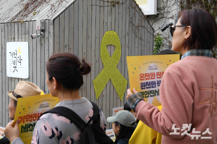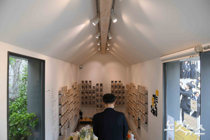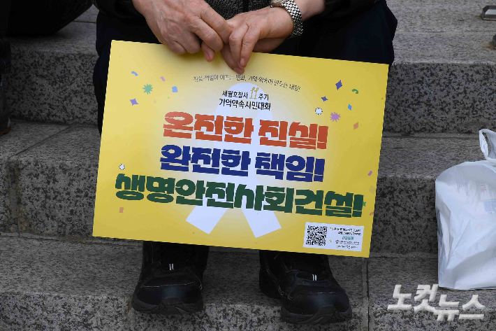 4·16 세월호참사 11주기인 16일 서울시의회 본관 앞 세월호 기억공간에서 11주기 시민기억식이 진행되고 있다. 지난 2014년 4월 15일 인천항에서 승무원 33명, 여객 443명을 태우고 제주항으로 향하던 세월호는 다음날인 16일 오전 10시 17분쯤 전남 진도군 병풍도 등대에서 약 4해리 떨어진 해상에서 전복됐다. 이 사고로 안산 단원고 학생들과 교사를 포함해 304명이 숨졌다.