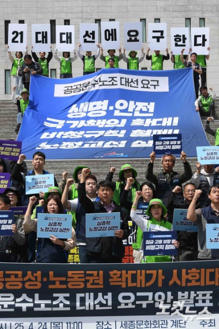 민주노총 공공운수노조가 24일 서울 종로구 세종문화회관 계단에서 대선 요구안 발표 기자회견을 열어 생명·안전 국가책임 확대, 비정규직 철폐 등을 촉구하고 있다.