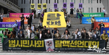 전국 481개 범시민사회단체가 24일 서울 종로구 세종문화회관 계단에서 탈핵선언대회를 열어 차기 정부 핵발전소 추가 건설 중단 등을 촉구하고 있다.