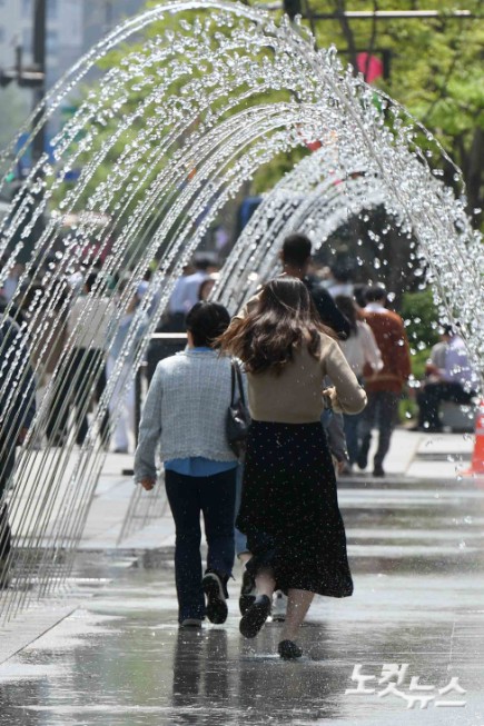 20도 안팎의 봄날시를 보인 24일 서울 광화문광장 바닥분수에서 시민들이 화창한 날씨를 만끽하고 있다.