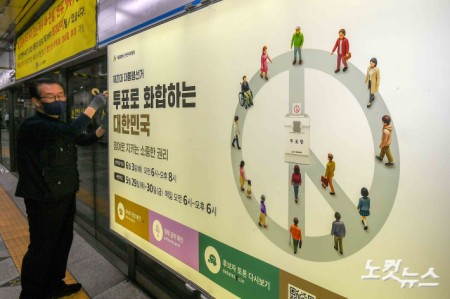 서울시선관위 관계자들이 14일 서울 종로구 지하철 4호선 혜화역 승강장에서 투표독려 홍보물을 스크린도어에 첩부하고 있다.