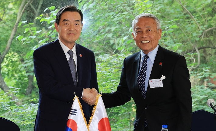김윤 한일경제협회 회장(왼쪽)과 아소 유타카 일한경제협회 부회장이 28일 서울 시내 한 호텔에서 제57회 한일경제인회의 공동성명 채택 기자회견을 하기에 앞서 악수하고 있다. 연합뉴스한국과 일본의 경제인들이 인공지능(AI), 반도체 등 첨단 산업을 중심으로 경제 협력을 확대하기로 했다. 양국 경제계는 한국의 포괄적·점진적 환태평양경제동반자협정(CPTPP) 가입을 위한 협력에도 뜻을 모았다.