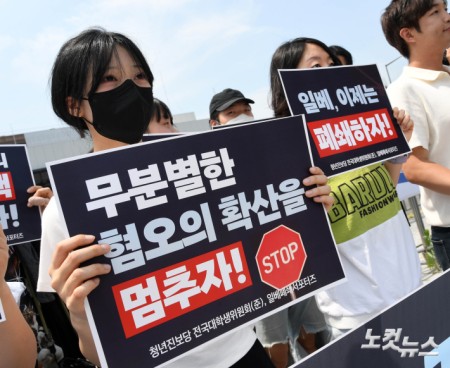 19일 오전 서울 용산구 대통령실 앞에서 열린 ‘진보당, 일베폐쇄 서명 11만 대통령실 전달 기자회견’ 참석자들이 구호를 외치고 있다.