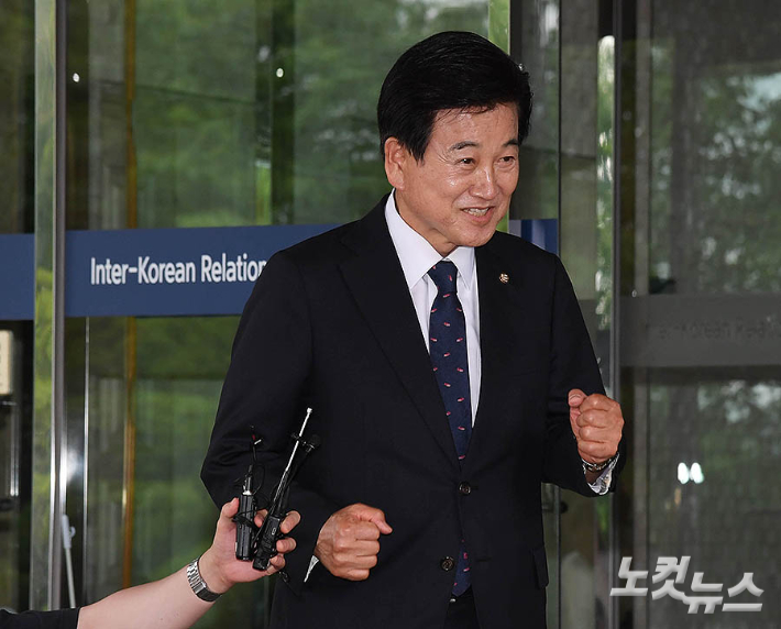 정동영 통일부 장관 후보자가 24일 오후 서울 종로구 남북관계관리단 회담장에 마련된 인사청문회 준비 사무실로 출근하며 취재진의 질문에 답하고 있다. 정 후보자는 "갈등을 풀어야 적대와 대결을 넘어설 수 있고 다시 화해와 협력의 시대로 재진입할 수 있다"며 "화해와 조화로운 해결, 그리고 협력해서 선을 이루라는 말도 있지 않나. 제가 해야 할 일은 한반도의 평화와 안정을 다지는 일이라 생각한다" 고 말했다. 정 후보자 임명이 확정되면 2005년 노무현 정부 통일장관을 한 지 20년 만에 다시 통일부 장관으로 복귀하게 된다. 앞서 정 후보자는 장관 재임 당시 개성공단 사업을 이끌었고 북한에 특사 자격으로 방문해 김정일 국방위원장과 단독 면담을 갖기도 했다.