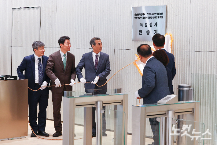 김건희 특검팀(특별검사 민중기)이 2일 오전 사무실이 위치한 서울 종로구 KT 광화문 빌딩 웨스트(West) 2층에서 현판식을 열었다. 특검팀은 20일간의 준비 기간을 마치고 최장 150일 간의 수사를 개시했다. 민중기 특별검사는 "모든 수사는 법이 정한 절차와 방식에 따라 이뤄질 것"이라고 소감을 밝혔다.