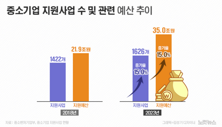 중소벤처기업부에 따르면 정부 및 지방자치단체의 중소기업 지원사업은 2018년 1422개에서 2023년 1646개로 15.7% 증가했다. 예산도 21.9조원에서 35.0조원으로 대폭 늘었다.