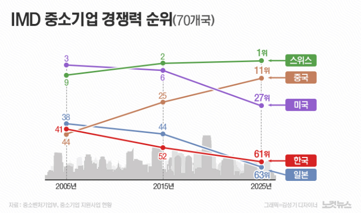 IMD(스위스 국제경영개발대학원)가 발표하는 국가 경쟁력 평가에 따르면 한국의 중소기업 경쟁력 순위는 2005년 41위에서 2025년 61위로 계속 하락해 최하위권에 머물고 있다. 경쟁국인 중국의 중소기업 순위가 같은 기간 44위에서 11위로 상승한 것과 대조적이다.
