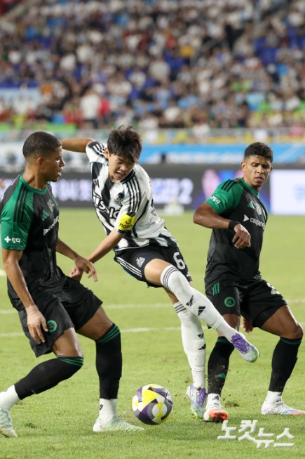 30일 수원월드컵경기장에서 열린 2025 쿠팡플레이 시리즈 팀 K리그와 뉴캐슬 유나이티드의 경기. 뉴캐슬 박승수가 슛을 하고 있다.