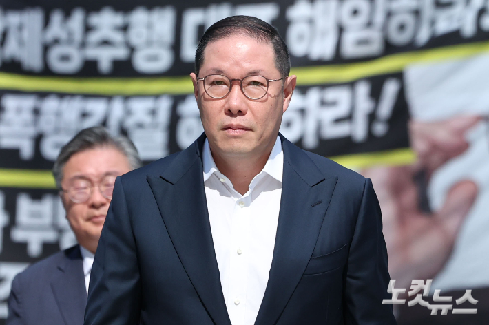 '집사 게이트' 의혹을 받고 있는 조현상 HS효성 부회장이 4일 오전 서울 종로구 KT 광화문빌딩에 마련된 김건희특검 사무실로 출석하고 있다.