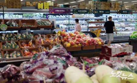 폭염과 폭우 등 이상 기후의 영향으로 지난달 밥상 물가 상승률이 1년 만에 가장 많이 뛰었다. 11일 통계청 국가통계포털(KOSIS)에 따르면 7월 식료품 및 비주류음료 물가지수는 125.75(2020년=100)으로 지난해 같은 달보다 3.5% 올랐다. 이는 지난해 7월(3.6%) 이후 1년 만에 가장 높은 수준이다. 사진은 11일 서울시내 한 대형마트를 찾은 시민들의 모습.