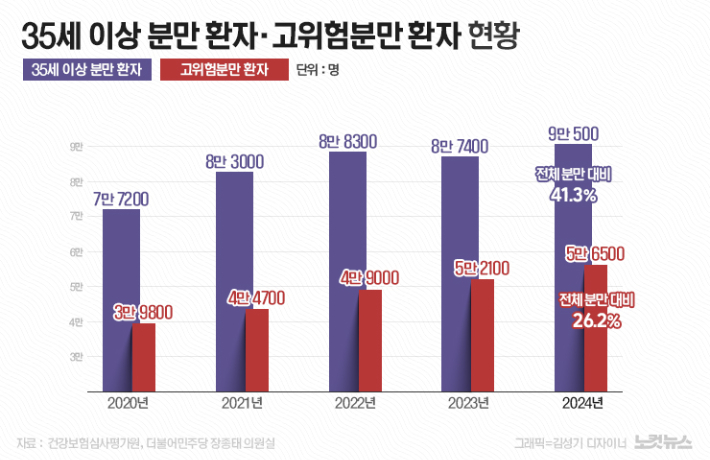이는 4년 새 무려 42%가 증가한 수치다. 고위험분만 환자는 지난 2020년 3만 9800여 명→2021년 4만 4700여 명→2022년 4만 9천여 명→2023년 5만 2100여 명 등 최근 2년 단위로 앞자릿수를 갈아치우고 있다.