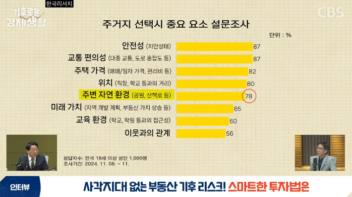 ◇ 박원갑> 너무 세게 얘기하시는 것 같습니다. 너무 앞서가신 것 같은데 그 정도는 아니고요. 다만 쾌적한 주거 공간을 찾는 게 하나의 메인 트렌드가 되면서 아파트 선택의 새 기준이 될 수 있는 것 같아요. 최근에 한국 리서치 여론조사 사업본부 조사에서 주거지 선택을 할 때 공원이나 산책로가 어느 정도 영향을 미치는지 보니 한 78% 정도 됐습니다.