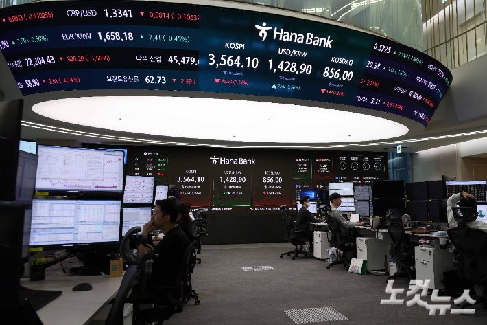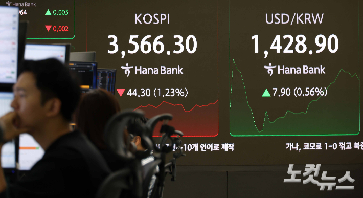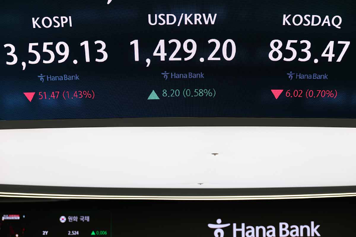 코스피 지수가 하락 출발한 13일 서울 중구 하나은행 본점 딜링룸 현황판에 코스피 지수가 표시돼 있다.
