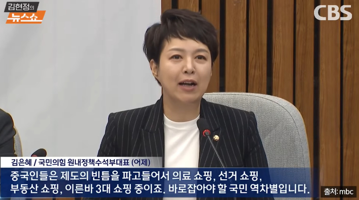 [김은혜(국민의힘 원내정책수석부대표): 중국인들은 제도의 빈틈을 파고들어서 의료 쇼핑, 선거 쇼핑, 부동산 쇼핑 이른바 3대 쇼핑 중이죠. 바로잡아야 할 국민 역차별입니다.]
