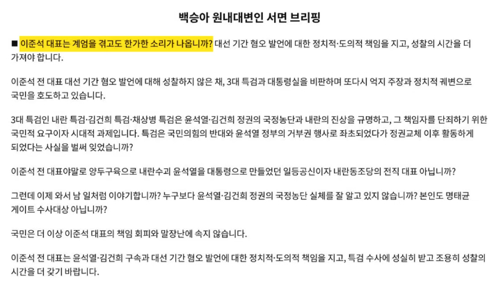 ◇ 김현정> 사진 준비해 오신 거 보니까 백승아 민주당 원내대변인의 서면 브리핑을 준비해 오셨어요. 첫 줄이 이준석 대표는 계엄을 겪고도 한가한 소리가 나옵니까? 여기다가 야광펜으로 줄 쳐 오셨네요. 무슨 얘기를 하시려는 건지 잠시 후에 한번 들어보겠습니다. 박원석 의원님.