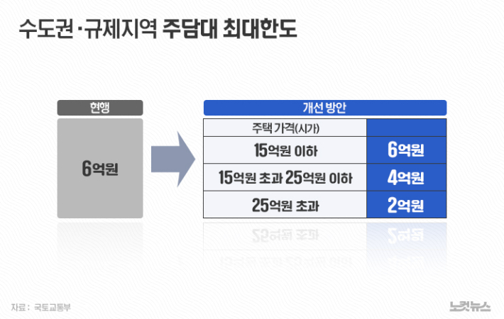 이날 발표된 대책에선 6·27 대출 규제 이후 6억 원으로 일괄 적용돼온 주택담보대출 한도가 보다 강화됐다. 수도권 및 규제지역의 ①시가 15억 원 이하 주담대 한도는 현행과 동일한 6억 원 ②시가 15억 원 초과 25억 원 이하 주택은 4억 원 ③시가 25억 원 초과 주택은 2억 원으로 대출한도를 차등 적용한다.