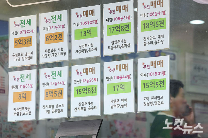 정부가 전날 발표한 '10·15 부동산 대책'으로 주택시장이 충격에 빠진 가운데 16일 오후 서울 성동구의 한 공인중개사무소 앞에서 직원이 매물 안내문을 떼고 있다.