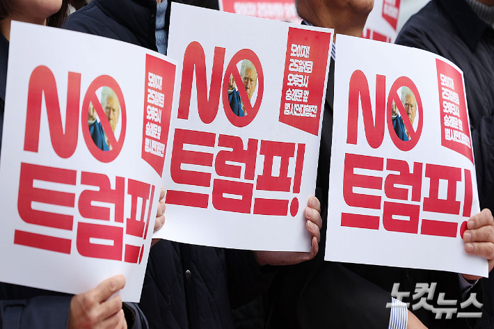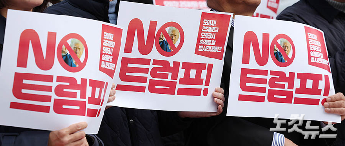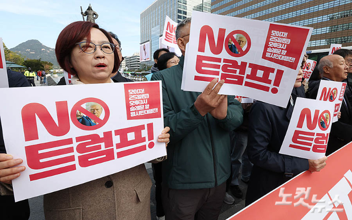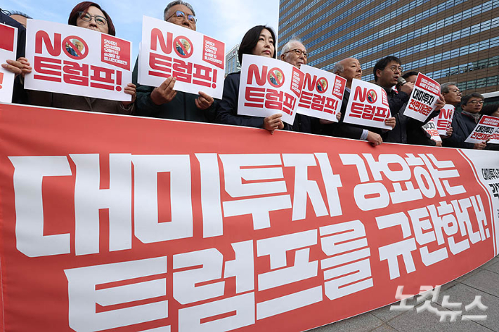 21일 오전 서울 종로구 광화문 광장에서 열린 '대미투자 강요하는 트럼프를 규탄한다!' 대미투자 전면 재검토 각계 시국선언 기자회견에서 참석자들이 구호를 외치고 있다.
