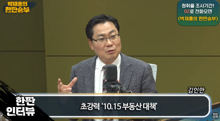 ◇ 박재홍> CBS 라디오 박재홍의 한판승부 2부 문을 열었습니다. 2부에서는 부동산 얘기를 해 보겠습니다. 지난주 정부의 새로운 부동산 정책, 1015 부동산 대책. 굉장히 지금 논란이 많이 있고 과연 그렇다면 정책의 목적 효과는 달성할 수 있을 것이냐. 이 부분에 대한 질문을 하겠습니다. 김인만 부동산 경제연구소 소장과 함께합니다. 소장님, 어서 오십시오.