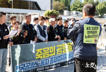 22일 서울 용산구 대통령실 앞에서 열린 '전국공항노동자 총파업 지지 비정규직 노동자 기자회견' 참석자들이 발언을 하고 있다.