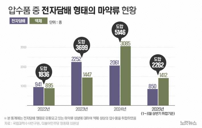2024년 전자담배 2061종·액체 3085종(도합 5146종)으로 늘었다. 올해는 6월 말 기준 전자담배 850종·액체 1412종 등 2262종이 국과수를 거쳤다.