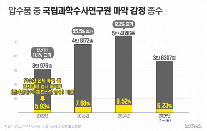 연도별 마약류 압수품 대비 비율로 계산하면 2022년 5.93%→2023년 7.68%→2024년 9.52%에 달한다.