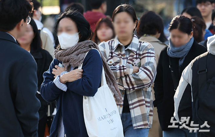 일부 지역에 올 가을 첫 한파주의보가 발효되는 등 초겨울 날씨를 보이는 27일 오전 서울 종로구 광화문네거리에 두꺼운 옷을 입은 시민들이 발걸음을 재촉하고 있다.