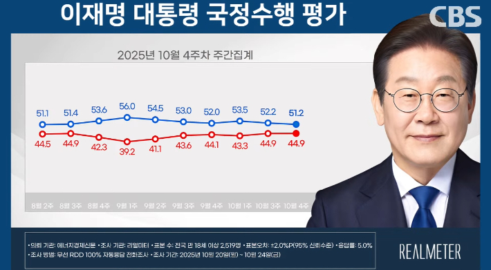 ◇ 김현정> 최민희 의원 자녀 결혼식이 불러온 나비 효과, 아마 우상호 수석에 대통령 자녀 결혼식까지 이제 일파만파로 커져가고 있는 이슈 한번 다뤄봤고요. 이 얘기 좀 해보죠. 어제 리얼미터의 지지율 정례 조사를 보니까 리얼미터가 에너지경제신문 의뢰로 조사한 거고요. 10월 넷째 주 국정수행 지지율인데 대통령의 지지율이 1% 포인트 하락한 51. 2%를 보였습니다. 매우 잘한다가 39. 3%, 잘하는 편이다가 11. 9%, 부정 평가는 44. 9%, 매우 잘못한다 36. 6, 잘못하는 편이다 8. 3%. 자동 응답 전화 조사했고요. 10월 20일부터 24일까지 했고 자세한 내용은 여론조사 심의위원회 홈페이지를 보시면 되는데 지금 1% 포인트 하락한 걸 어떻게 볼 것이냐, 일단은 최저치에 근접했어요. 이재명 대통령 임기 내에 가장 낮았던 게 51. 1인데 이번에 51. 2를 기록했으니까 최저치까지 간 건 맞습니다만 부동산 대책 이후에 악화된 여론을 생각하면 그래도 선방했다는 얘기가 또 나오고 있고 그래서 이 지표를 어떻게 볼 것인가, 어떻게 해석하고 계시는가, 어떤 분 먼저.