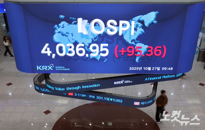 코스피 '드디어 사천피'…'10만전자'도 달성  코스피가 사상 처음으로 4천선을 돌파한 27일 오전 서울 여의도 한국거래소 전광판에 지수가 표시되고 있다. 이날 삼성전자도 '10만전자' 고지에 첫발을 디뎠다. 황진환 기자