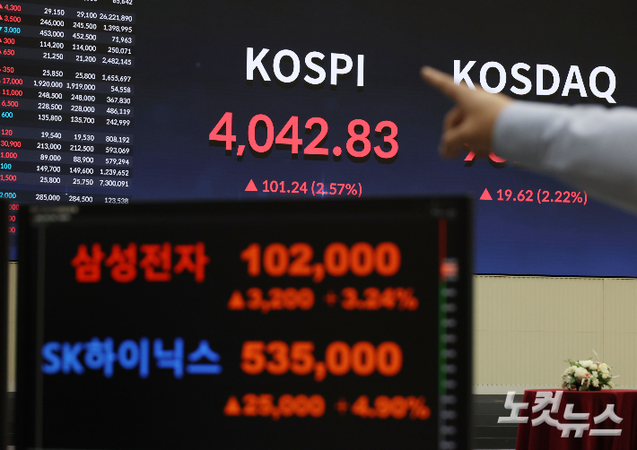 27일 사상 첫 4000선을 돌파한 코스피 지수가 4042.83에 마감했다. 이날 코스피 지수는 전 거래일 대비 101.24p(2.57%) 오른 4042.83에 거래를 마쳐 사상 최고가를 갈아치웠다. 종목별로 대장주인 삼성전자가 전장 대비 3.24%(3200원) 오른 10만 2000원으로 거래를 마쳤다. SK하이닉스도 4.90% 오른 53만 5000원을 기록했다. 사진은 27일 오후 서울 여의도 한국거래소 전광판 모습. 황진환 기자